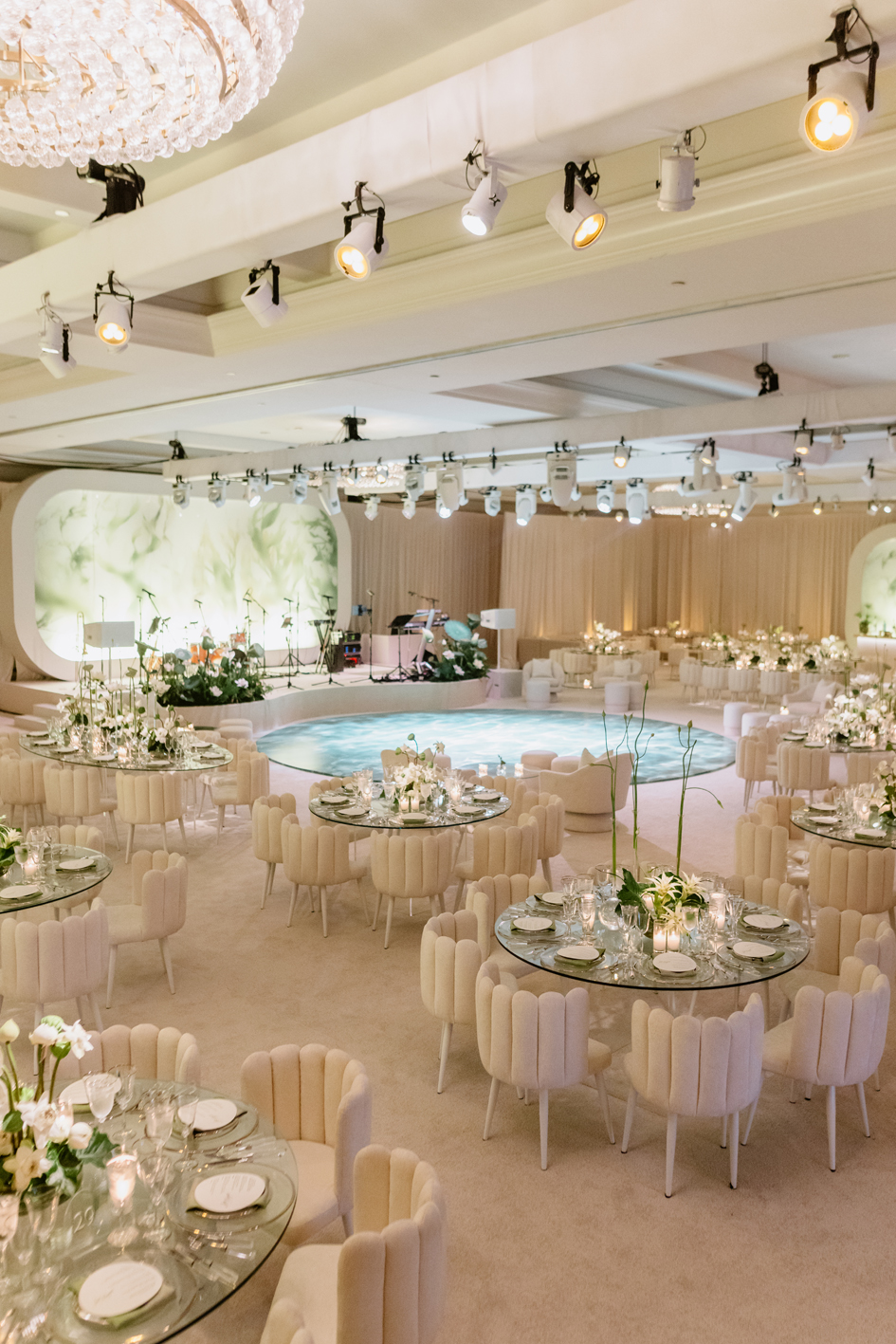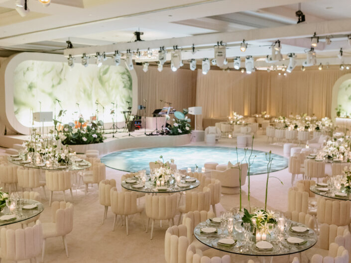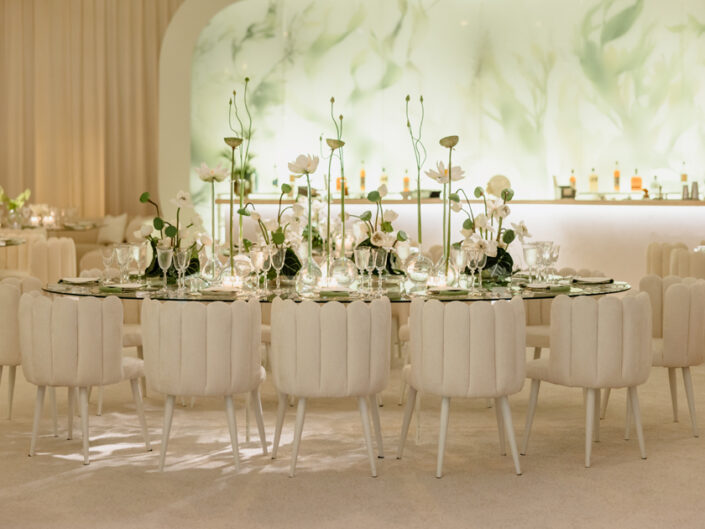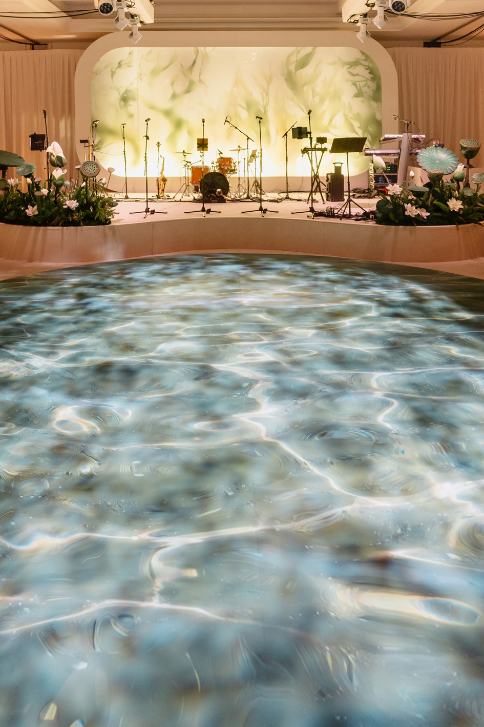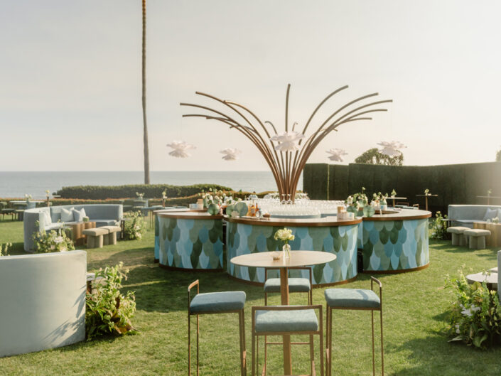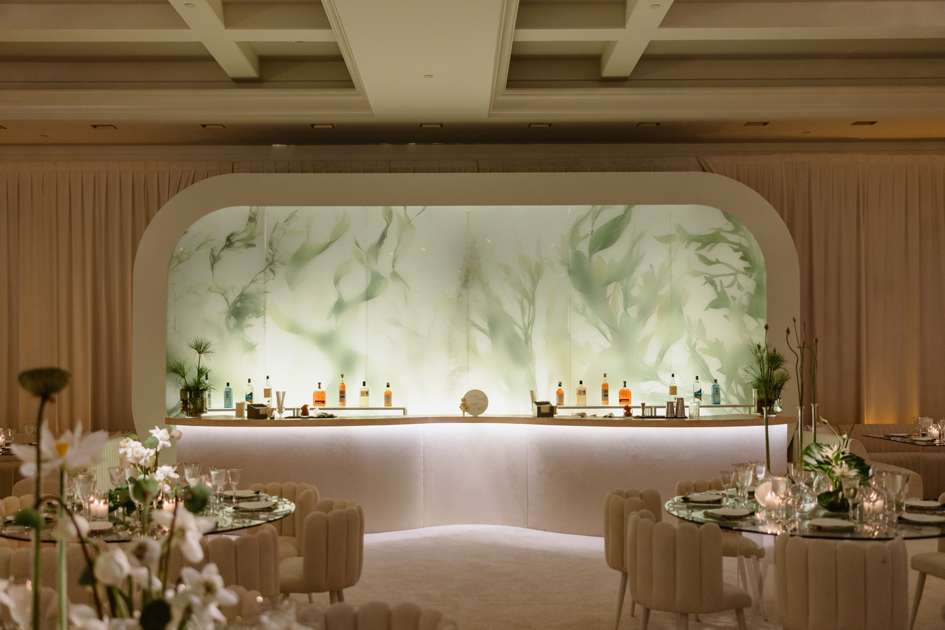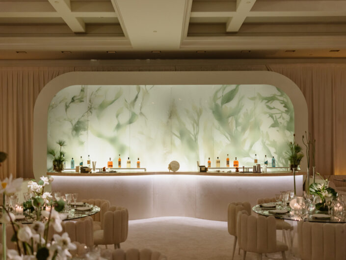 Dinner revealed a fully transformed ballroom – an immersive underwater world layered in cream draping, sea-inspired botanicals, lotus details, an ocean-floor-graphic dance floor, and two wave-shaped backlit bars simulating silhouettes of ocean plant life in motion. Lenticular seafloor menus, platinum-rimmed dinnerware, and ombré napkins completed the tableau. An exterior espresso martini lounge in monochromatic blue offered a quieter escape between sets.