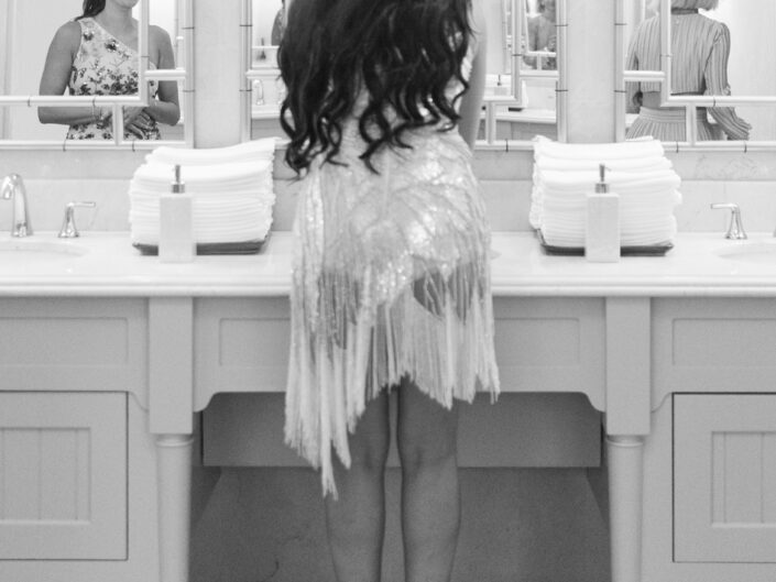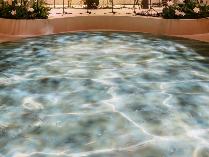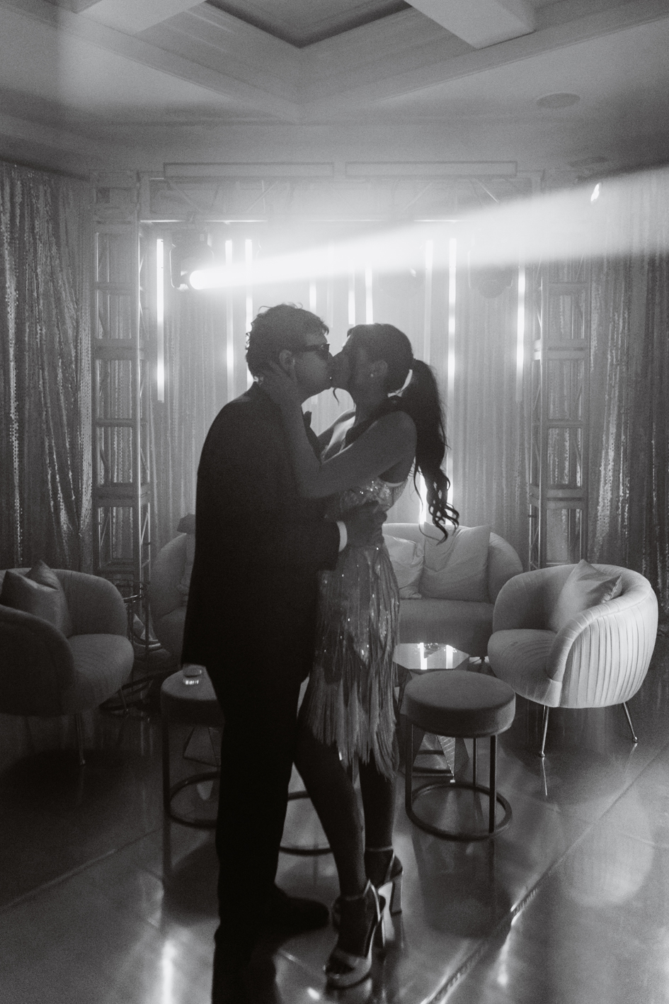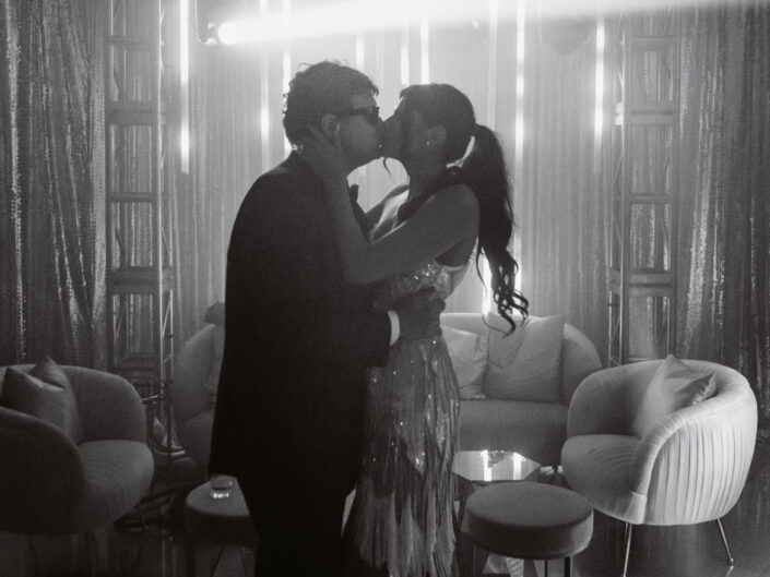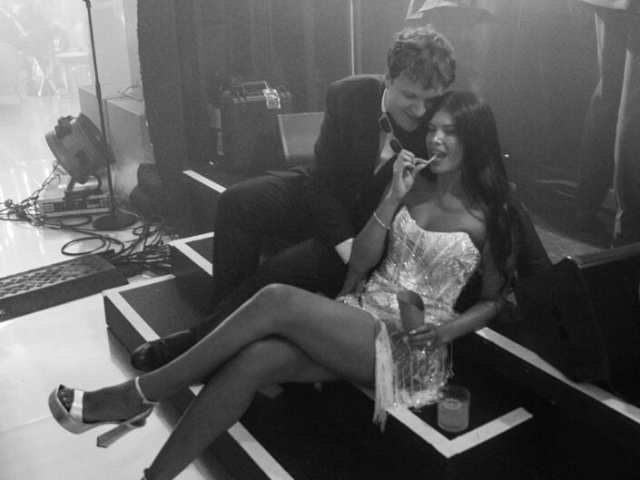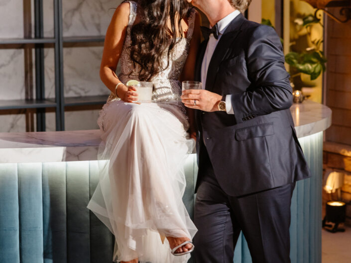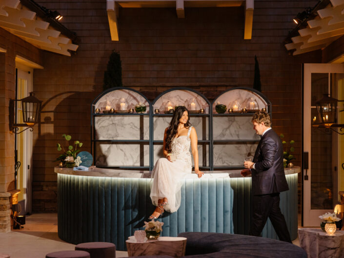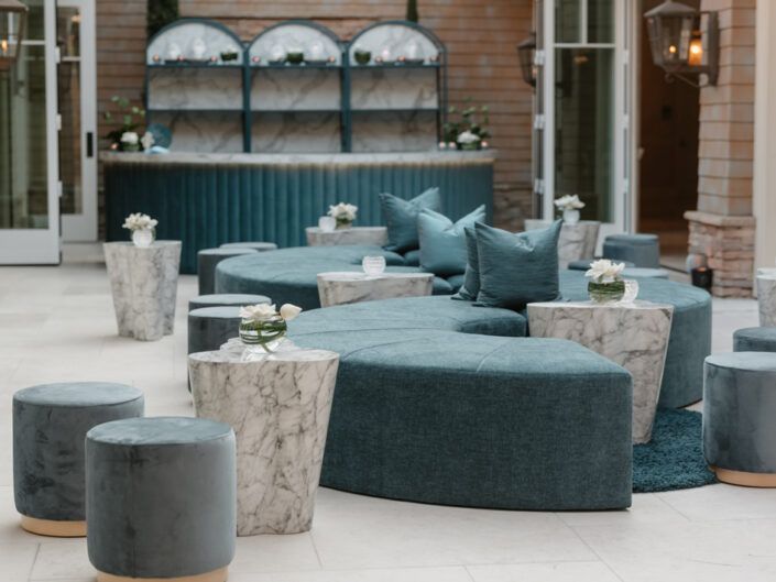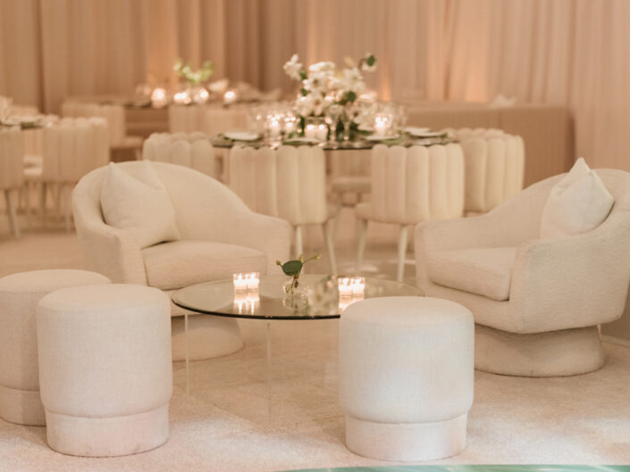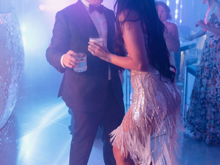 Dinner revealed a fully transformed ballroom – an immersive underwater world layered in cream draping, sea-inspired botanicals, lotus details, an ocean-floor-graphic dance floor, and two wave-shaped backlit bars simulating silhouettes of ocean plant life in motion. Lenticular seafloor menus, platinum-rimmed dinnerware, and ombré napkins completed the tableau. An exterior espresso martini lounge in monochromatic blue offered a quieter escape between sets.