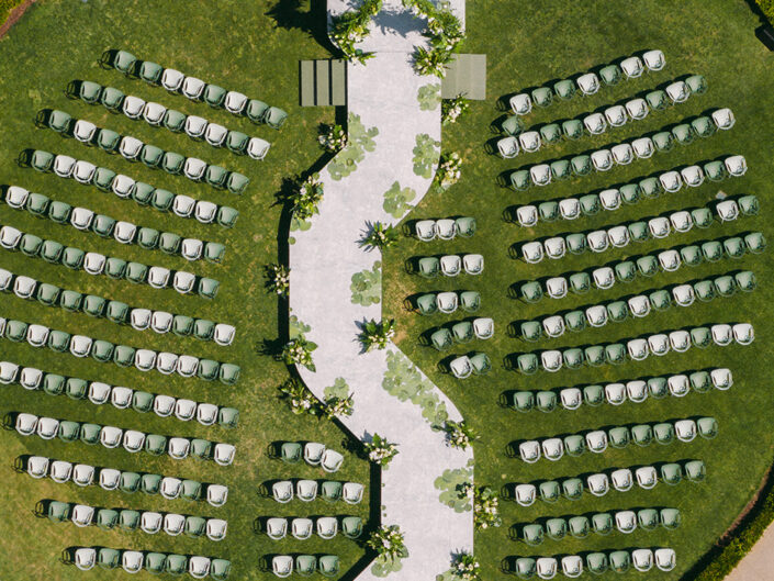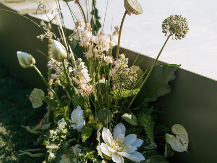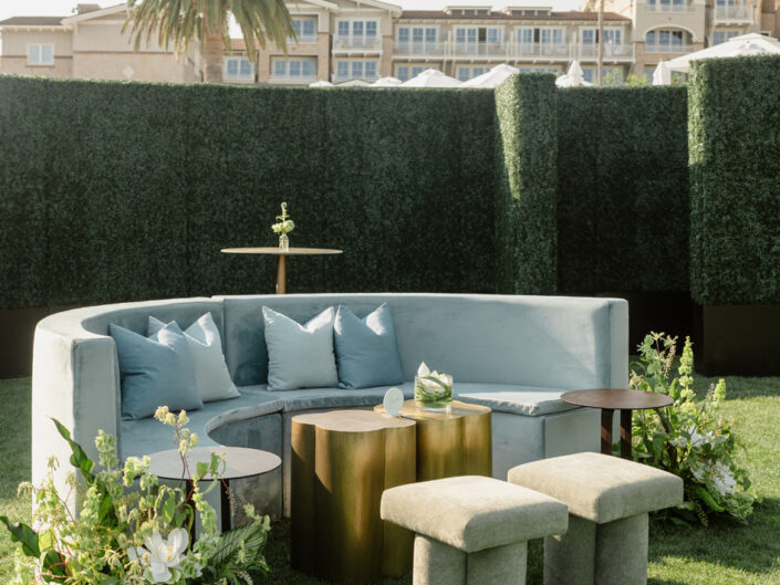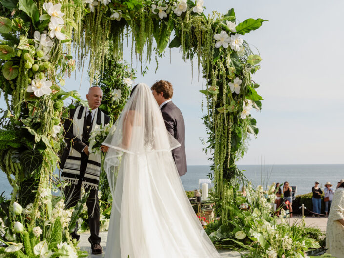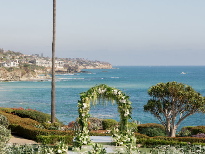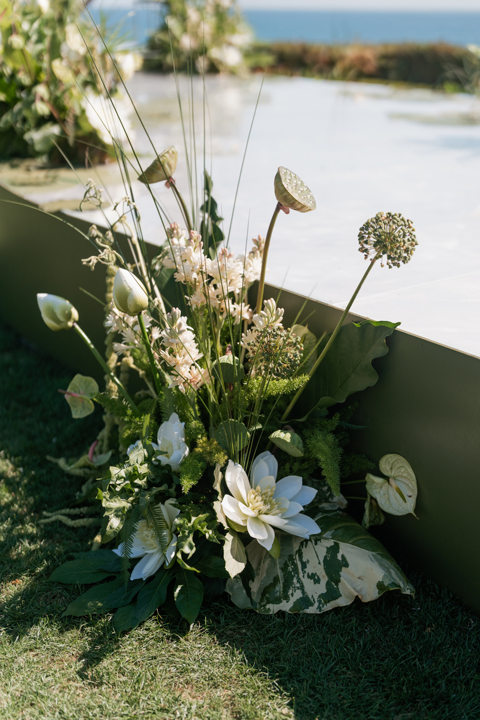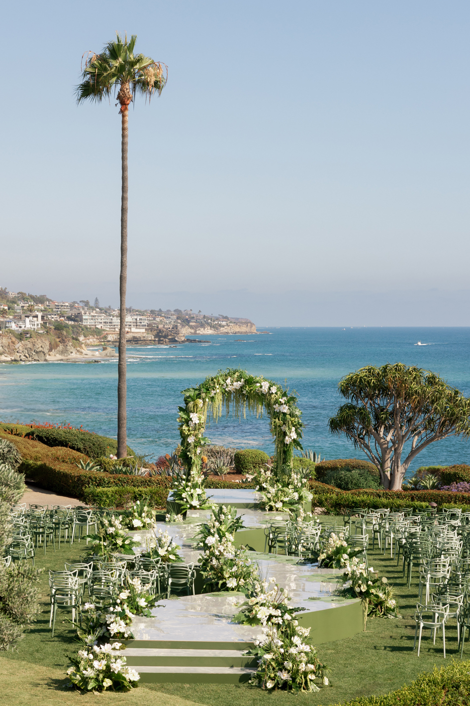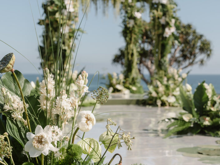 Guests arrived at the Montage Laguna Beach to a sage green pre-ceremony reception on the Studio Lawn – champagne cocktail bar, curated lounge vignettes, and a solo guitarist framed by unobstructed ocean views. The ceremony followed along a curved acrylic runway-style aisle where lily pads floated between trailing grasses and water lilies, leading to a chuppah of water lilies and cascading green amaranthus.
