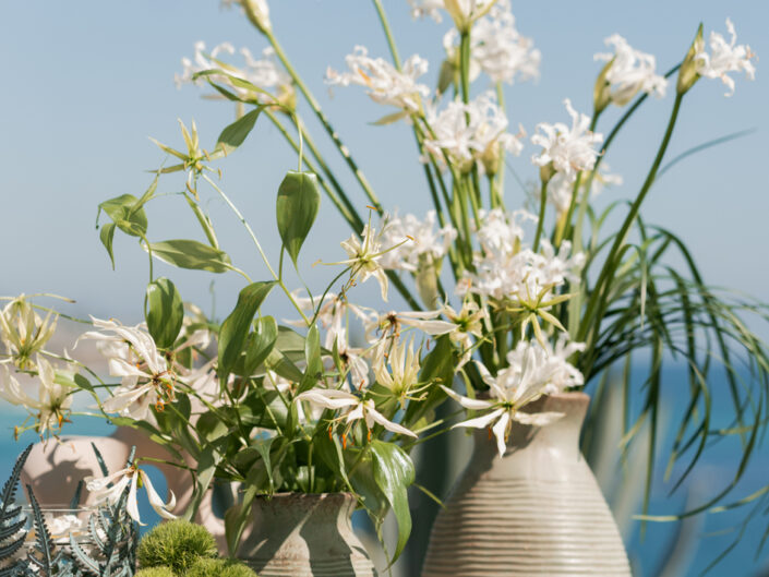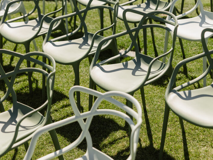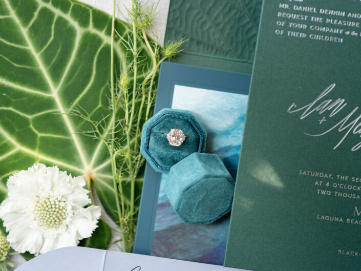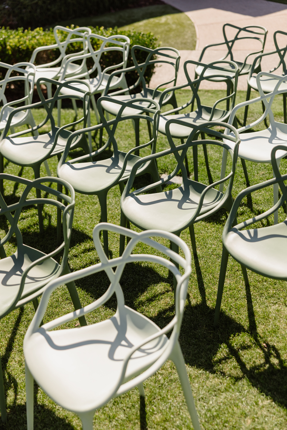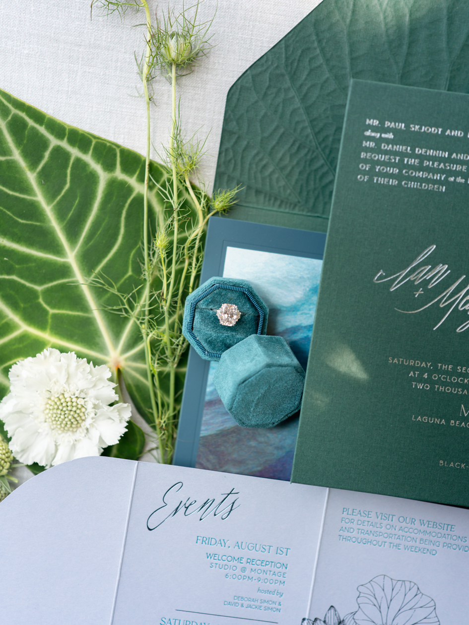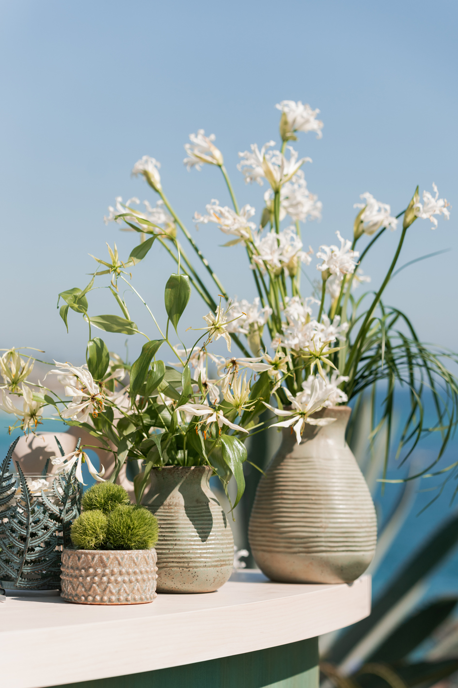 Guests arrived at the Montage Laguna Beach to a sage green pre-ceremony reception on the Studio Lawn – champagne cocktail bar, curated lounge vignettes, and a solo guitarist framed by unobstructed ocean views. The ceremony followed along a curved acrylic runway-style aisle where lily pads floated between trailing grasses and water lilies, leading to a chuppah of water lilies and cascading green amaranthus.