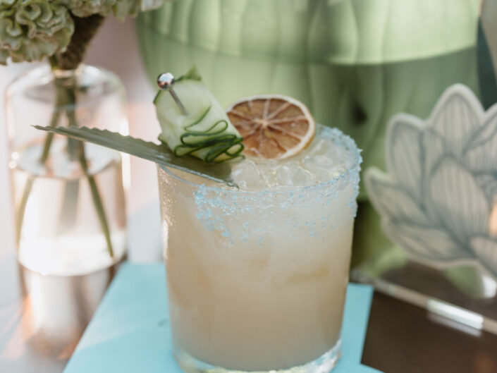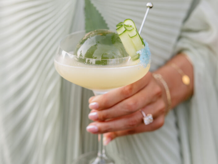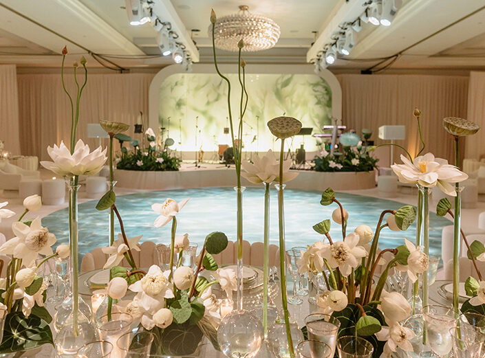 Cocktail hour shifted the palette to soft aqua – a lotus-inspired bar with scalloped green and blue fascia, patina copper countertops, and suspended lotus sculptures overhead anchored the space, while guests moved between tray-passed cocktails, custom margarita bars, and a live sushi station amid lush lakeside greenery.